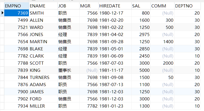 38 INSERT INTO EMP VALUES(7900,'JAMES','职员',7698,'1981-12-03',1250,NULL,30);