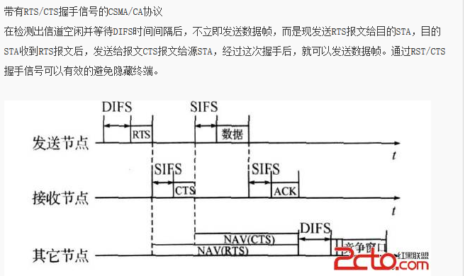 (2)不能像CSMA/CD有冲撞的侦察,就算是碰撞了,发送数据的节点也不知道。一个IEEE 802.11最大可以传输2000多个字节,为了让长分组在送的时候可以减少碰撞的几率,减少浪费的带宽,所以设计一个比较小的RTS帧和CTS帧作为先导(RTS帧以及CTS帧都比较小),RTS帧是广播说我要发送数据了,CTS帧广播说我要接收数据了。——举个例子(来自百度百科)RTS CTS (这是为了解决无法侦测的碰撞,利用这个可以让其他站点不要来干扰我收发数据)