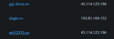 这里可以看到共有98个域名解析到这个地址。这是第一个需要怀疑的点,一个正常的工商类型的域名,解析IP不应该同时被这么多域名解析,按照常理正常的服务器应该只提供单个网站的功能,被这么多域名解析,必有蹊跷!