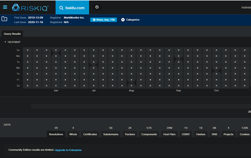 RISKIQ社区数据做的比较全,基本上基于一个域名或者IP,你能想到的相关信息都涵盖了,可惜数据虽然多但不是都有用,需要搜索者自己有判断信息的能力,否则可能沦陷到海量的信息中不知道该用什么。