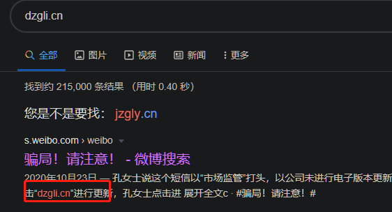 可以看到微博上已经有受害者上当受骗的相关新闻了。只可惜受骗的人没有提前看到我们的文章,没有学到我们的方法。