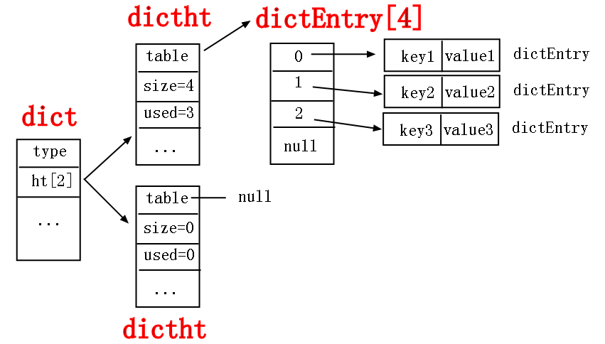 从上面这个结构体中,你可以看到一个非常重要的属性:dictEntry **table, 其中table是一个数组,数组类型是dictEntry,既然是一个数组,那后面的三个属性就好理解了,size是数组的大小,sizemask和数组求模有关,used记录数组中已使用的大小,现在我们把注意力放在dictEntry这个数组实体类型上面。