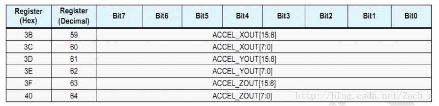 通过读取这6个寄存器,就可以读到加速度传感器 x/y/z 轴的值,比如读 x 轴的数据,可以通过读取 0X3B(高 8 位)和0X3C(低8位)寄存器得到,其他轴以此类推