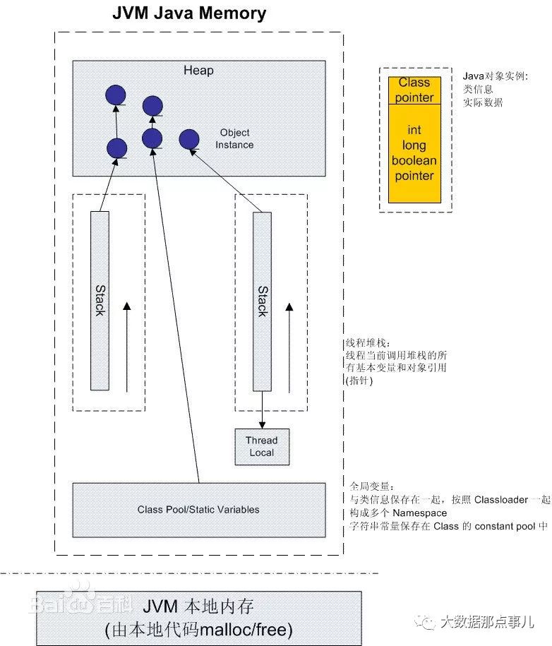 JVM的每个实例都有一个它自己的方法域和一个堆,运行于JVM内的所有的线程都共享这些区域;当虚拟机装载类文件的时候,它解析其中的二进制数据所包含的类信息,并把它们放到方法域中;当程序运行的时候,JVM把程序初始化的所有对象置于堆上;而每个线程创建的时候,都会拥有自己的程序计数器和Java栈,其中程序计数器中的值指向下一条即将被执行的指令,线程的Java栈则存储为该线程调用Java方法的状态;本地方法调用的状态被存储在本地方法栈,该方法栈依赖于具体的实现。