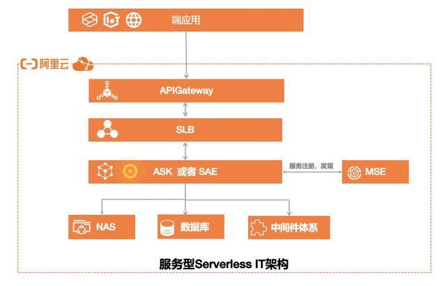 当前大部分应用都是服务型IT架构,如SpringBoot应用、PHP应用,这种架构模式可以很好的承接当前存量应用的云化迁移。基于阿里云MSE(微服务引擎),也适合微服务化架构的应用。这种架构支持按小时计费的模式,即开即用,相对于函数型IT架构,更适合稳定的大流量业务场景。