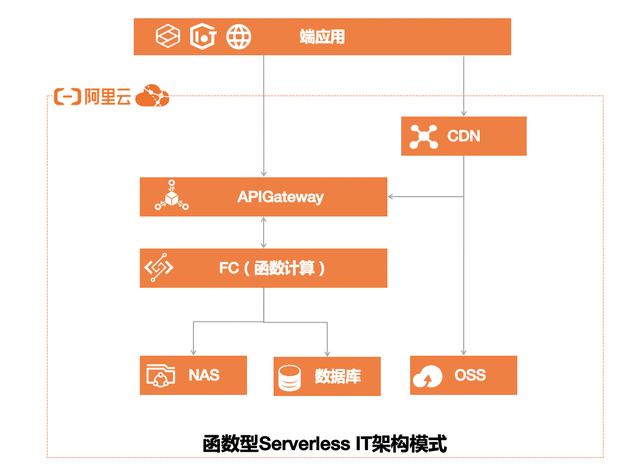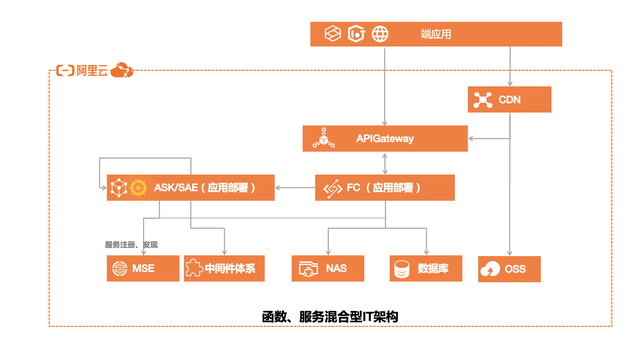 混合型IT架构,充分利用函数型Serverless、服务型Serverless各自的优势,端侧接入采用函数计算,按调用次数计费,以及快速敏捷的弹性伸缩能力轻松支持各种峰谷流量。而服务型Serverless,可以组合各种中间件服务,形成高性能、弹性灵活的微服务中台系统,可以支持当前主流复杂的应用场景。