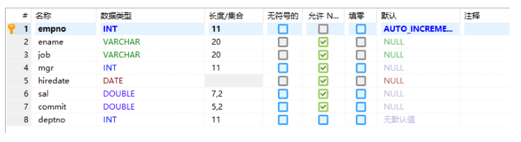 CREATE TABLE emp(empno INT PRIMARY KEY AUTO_INCREMENT,--主键约束ename VARCHAR(20),job VARCHAR(20),mgr int,hiredate DATE,sal DOUBLE(7,2),commit double(5,2),deptno INT NOT NULL -- 非空约束);-- √ 添加 唯一约束和非空约束ALTER TABLE exam MODIFY NAME VARCHAR(21) UNIQUE NOT NULL;-- 创建主表CREATE TABLE dept(deptno INT PRIMARY KEY,dname VARCHAR(20),loc VARCHAR(20));INSERT INTO dept VALUES(10,'餐饮部','上海'),(20,'销售部','浙江'),(30,'财务部','北京'),(40,'技术部','深圳');为从表emp加外键ALTER TABLE emp ADD FOREIGN KEY (deptno) REFERENCES dept(deptno);