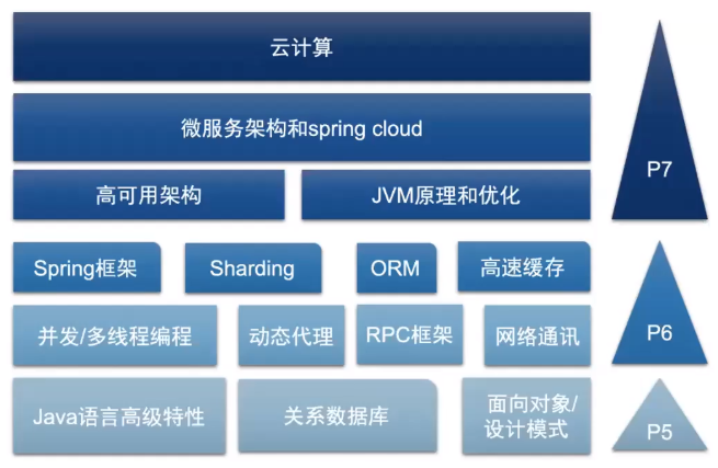 当然不同级别的面试,要求也不一样。所以被问到答不上来时,也不要觉得面试凉了,这可能只是面试官在确定你的考察级别。以阿里P5-P7来看,要求的知识结构大概是这样: