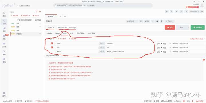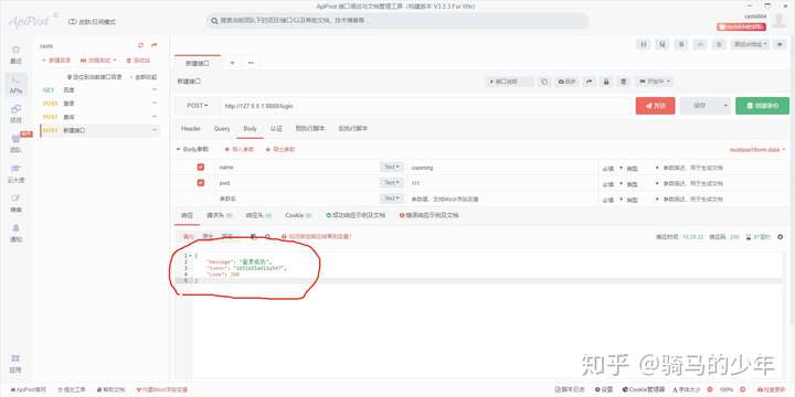 选择请求方法post、请求地址:http://127.0.0.1:8888/login、body参数:name:xiaoming,pwd:111