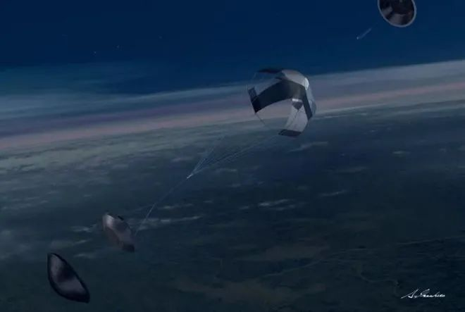 ▲日本小行星取样任务探测器Hayabusa2太空舱降落在地球上的艺术渲染图