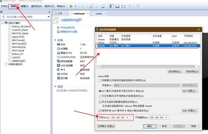 选择Vmnet8 NAT模式,查看子网ip:192.168.233.0