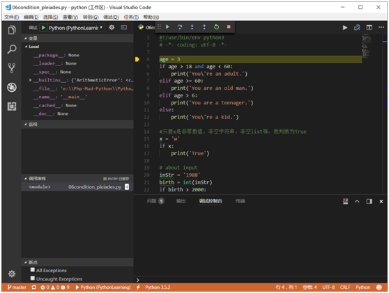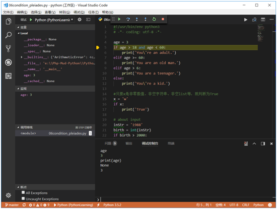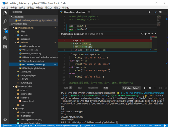 这里需要提醒一下的是,左上角的下拉选择调试模式中,常用的两个是Python和Integrated Terminal/Console,第一个就是在插件自带的环境中调试运行,第二个就是集成的控制台中。问题是,第一种暂不支持input()输入,所以想调试带input的程序,就选择Integrated Terminal/Console或者External Terminal/Console也是可以的。