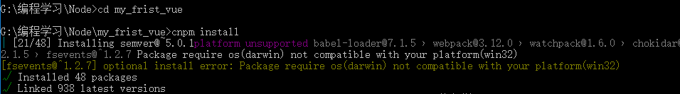 使用cnpm install 命令,直接安装依赖项,安装完成后,在项目目录下,会出现一个node_modules依赖包文件夹
