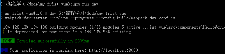 执行“cnpm run dev”命令,就会自动打包,生成项目,在浏览器中输入“http://localhost:8080”查看