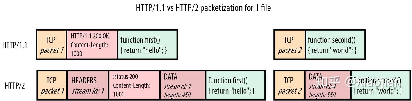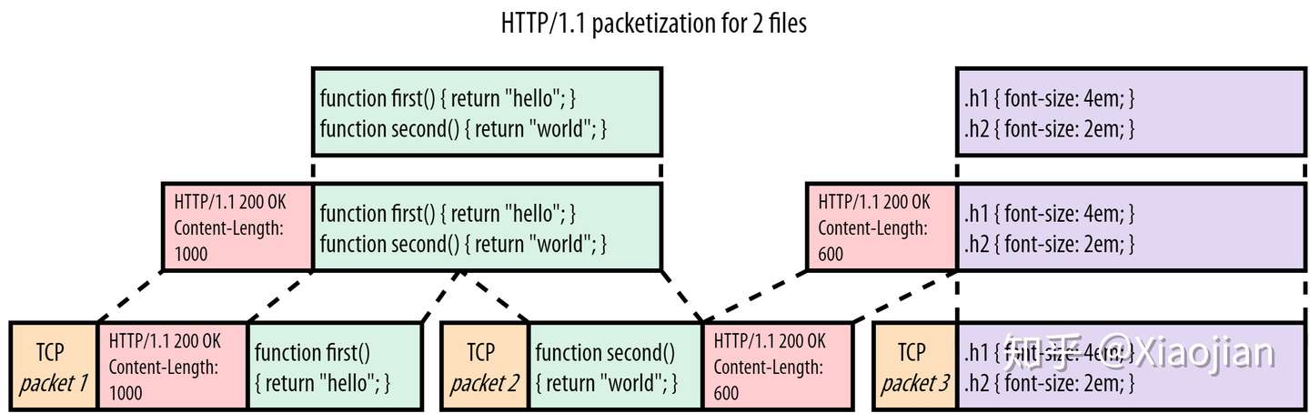 同样,您可以说有一个简单的解决方案:让浏览器查找HTTP/1.1 {statusCode} {statusString}\n模式来查看新的头块何时开始。这可能适用于 TCP 数据包2(packet 2),但在数据包3(packet 3)中会失败:浏览器如何知道绿色的script.js块在哪里结束和紫色style.css块从哪里开始?