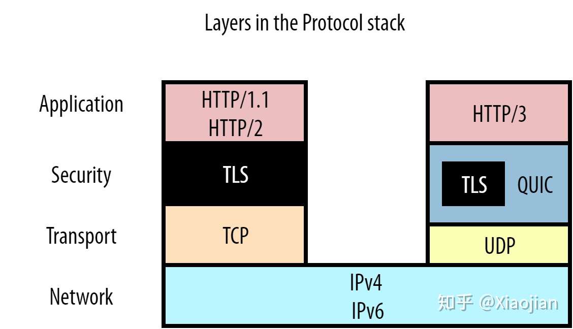 在这篇(很长,我知道)的文章中,我们一直在追踪队头阻塞。我们首先讨论了为什么 HTTP/1.1 会受到应用层队头阻塞的影响。这主要是因为 HTTP/1.1 没有识别单个资源块的方法。HTTP/2 使用帧来标记这些块并启用多路复用。这解决了 HTTP/1.1 的问题,但遗憾的是HTTP/2 仍然受到底层 TCP 的限制。由于 TCP 将 HTTP/2 数据抽象为一个单一的、有序的、但不透明的流,因此如果数据包在网络上丢失或严重延迟,它将遭受队头阻塞。QUIC 通过将 HTTP/2 的一些概念引入传输层来解决这个问题。这反过来会产生严重的影响,因为跨流的数据不再是完全有序的。这最终导致需要一个全新的版本 HTTP/3,它只运行在 QUIC 之上(而 HTTP/2 只运行在 TCP 之上,请参见图6)。