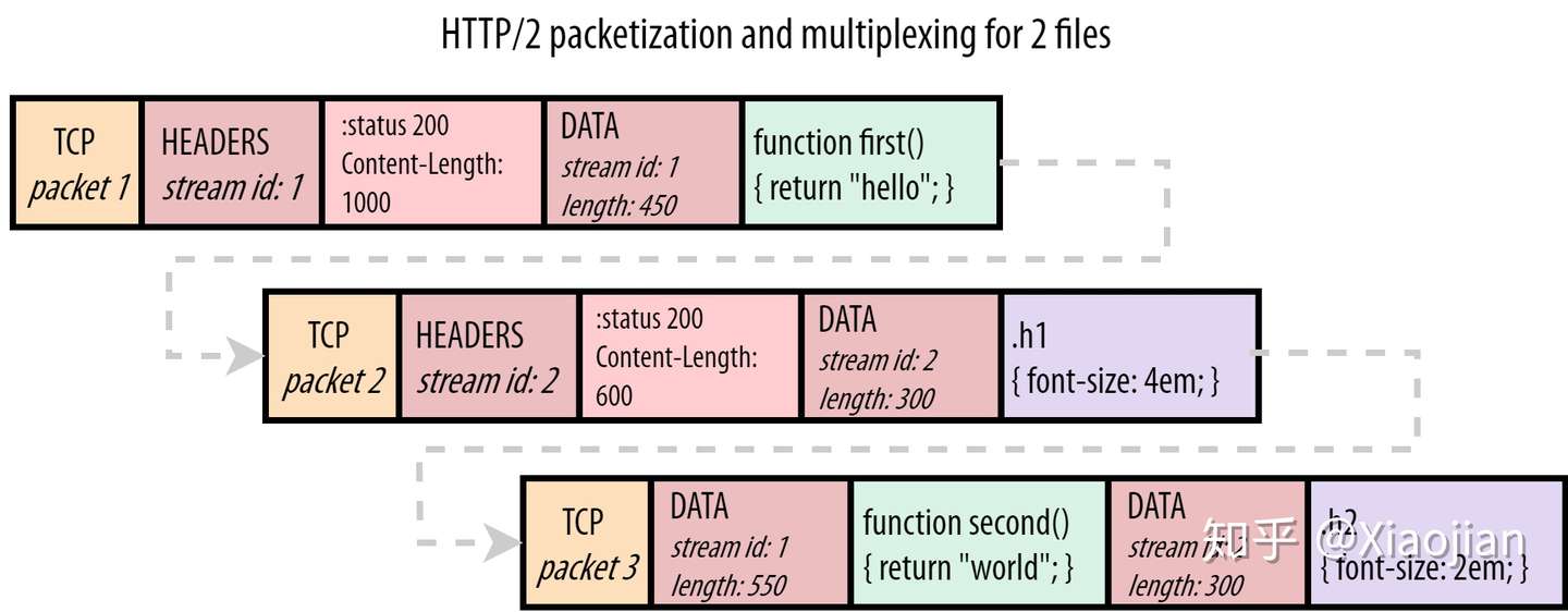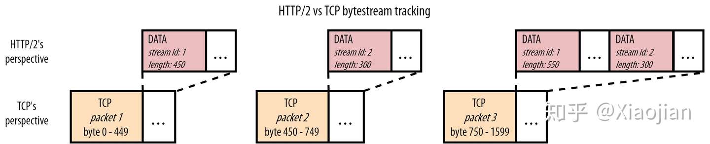 虽然我们和浏览器都知道我们正在获取 JavaScript 和 CSS 文件,但 HTTP/2 不需要知道这一点。它只知道它在使用来自不同资源流 id (stream id)的块。然而,TCP 甚至不知道它在传输 HTTP!TCP 所知道的就是它被赋予了一系列字节,它必须从一台计算机传输另一台计算机。为此,它使用特定最大大小(maximum size)的数据包,通常大约为1450字节。每个数据包只跟踪它携带的数据的那一部分(字节范围),这样原始数据就可以按照正确的顺序重建。