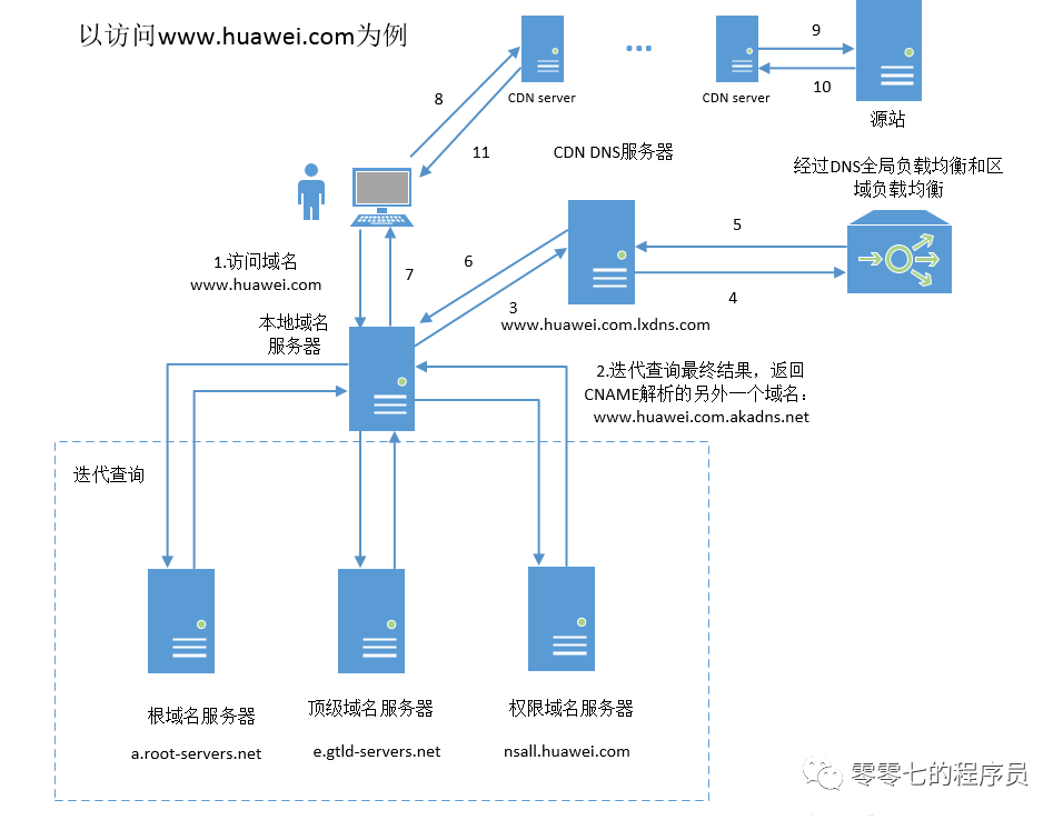 用户访问 www.huawei.com.lxdns.com 的IP地址对应的CDN server(CDN 节点),如果有缓存则直接到步骤11返回数据。如果没有则进行步骤9回源,再到步骤10,再到步骤11,返回数据。