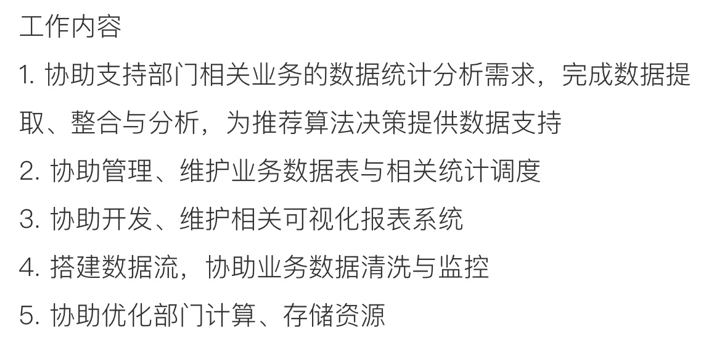把这些都写在一块并不是说这两种工作内容是一样的,其实差别还是挺大的,不过 ETL 和 BI 的活其实是大数据开发工作的一部分(传统架构的 ETL 就不讨论啦)。这种专项的招聘要不就工资非常高,需要这方面的专家,来引导大方向;要不就很低,招聘的主要目的是为了能解决掉一些比较繁琐的且其他人不想干的活。