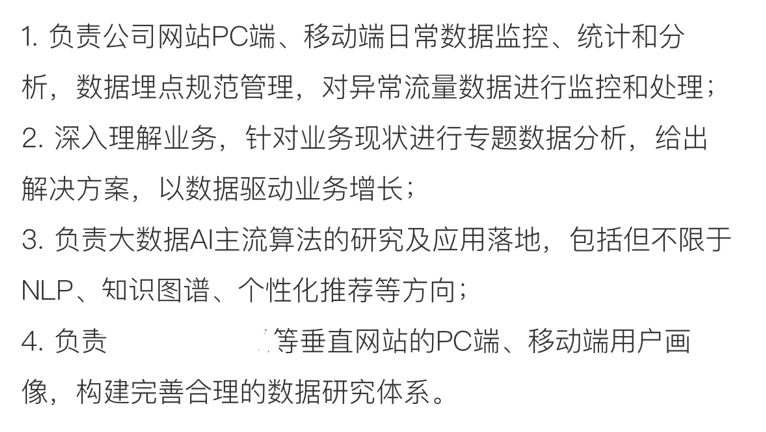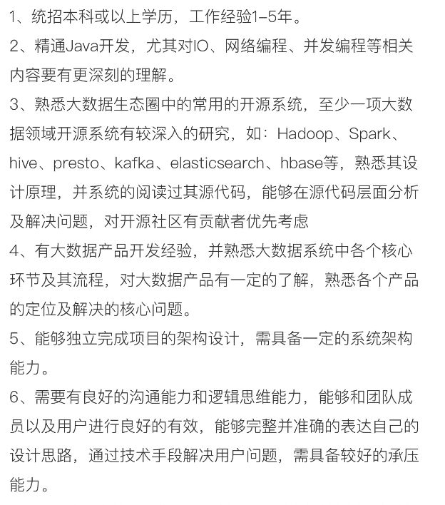 大数据开发,大数据平台开发,大数据系统开发,大数据应用开发等等好多种排列组合的说法其实都是类似的,都是同一种大数据猿类,只是各个公司的描述不同而已。为了更具有说服力,我在招聘网站上找了个比较通用的任职要求,大家先来看看。