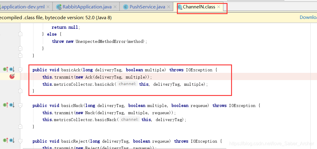 /** * 推送队列的监听 * 注解中为监听的队列 * @param * @param channel * @param tag * @throws IOException */ @RabbitListener(queues = "rabbit.direct.queue.push") public void processDirect(String str, Channel channel, @Header(AmqpHeaders.DELIVERY_TAG) long tag) throws IOException { System.out.println("收到消息"); System.out.println(str); //手动答应消费完成,从队列中删除该消息 channel.basicAck(tag,true); } - 源码看不太懂,但是打断点发现,在下图中,basicAck在手动答应时[channel.basicAck(tag,true);]运行了一遍,没有报异常,但是手动答应完之后,又会在执行一遍,此时就会在控制台打印下面的异常