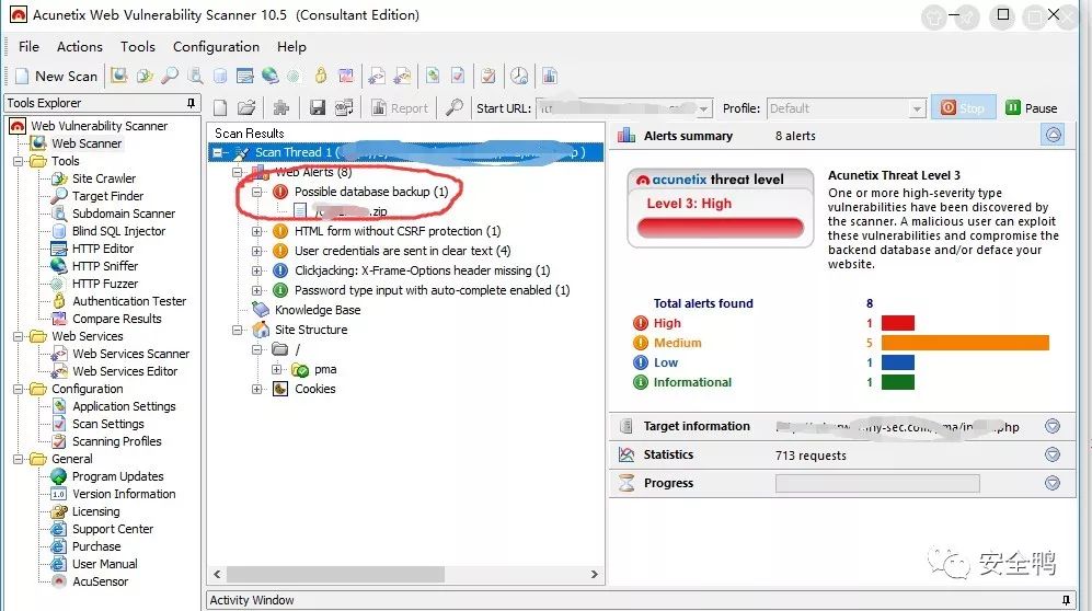 经过信息收集,可利用的信息还是有限,脚本小子决定使用AWVS进行全站扫描,没想到结果还很令人满意: