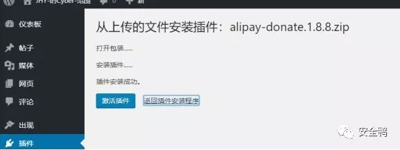 在后台插件上传处,我们准备上传我们制作好的带有shell的命名为alipay-donate.1.8.8的插件木马。