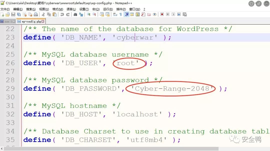 ..\cyberwar\wwwroot\default\wp\wp-config.php找到数据库登录密码: