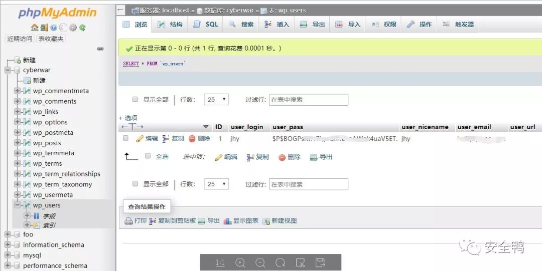 我们直接在数据库cyberarà表wp_users下面找到网站管理员用户,如上图所示。在尝试解码失败过后,使用sql语句将密码修改,然后用这个密码(jhy/yliang54)以管理员身份登录后台。成功!