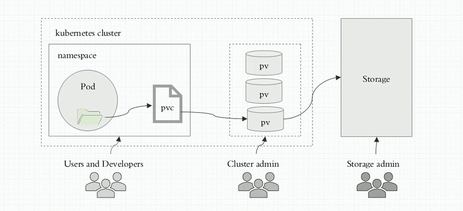 在定义pod时,我们只需要说明我们要一个多大的存储卷就行了,pvc存储卷必须与当前namespace的pvc建立直接绑定关系,pvc必须与pv建立绑定关系,而pv是真正的某个存储设备上的空间.