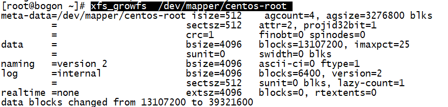 敲入命令:xfs_growfs /dev/mapper/centos-root