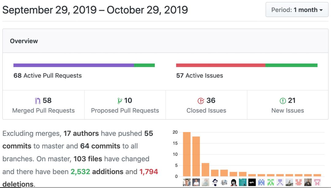 从上图中可以看到,在一个月的区间内,Apache APISIX 有 17 个贡献者参与,合并了 58 个 Pull Request,解决了 36 个 issue,新建了 21 个 issue,可见这是一个健康、活跃的开源项目。