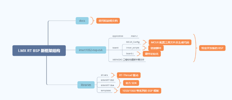i.MX RT 系列新框架按模块可以分为五部分,分别是使用和说明文档、特定开发板的 BSP,NXP 官方 SDK、RT-Thread 通用驱动和各个系列的工程模板。