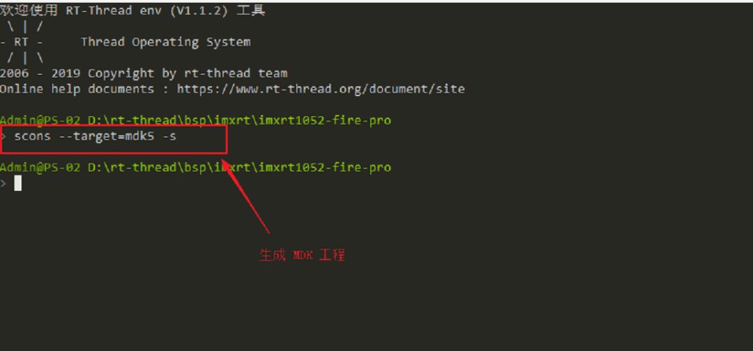 打开 Env 工具并输入 scons --target=mdk5 -s 命令来生成 MDK5 的工程,如下图所示: