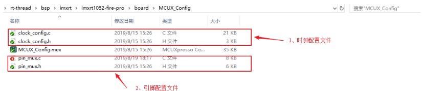 MCUX_Config:图形化配置工具生成的工程文件。虽然MCUXPresso Config工具生成了很多工程文件,但是 RT-Thread 只使用clock_config.c和pin_mux以及对应的头文件来生成工程。所以这里只保留相应的时钟和引脚的初始化文件。这里使用 MCUXpresso 工具的一个好处就是可以图形化的配置引脚,不同子系列的芯片外设之间的区别一般是使用的引脚不一样,使用 RT-Thread 外设驱动的第一步就是需要配置外设对应的引脚,而外设的初始化不需要使用工具配置,这个过程在 RT-Thread 外设驱动中完成。MCUXPresso Config生成的需要保留的工程文件如下图所示: