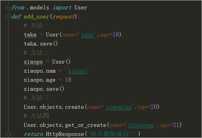 1.在视图函数中导入User模型类,然后使用下面的方法添加数据