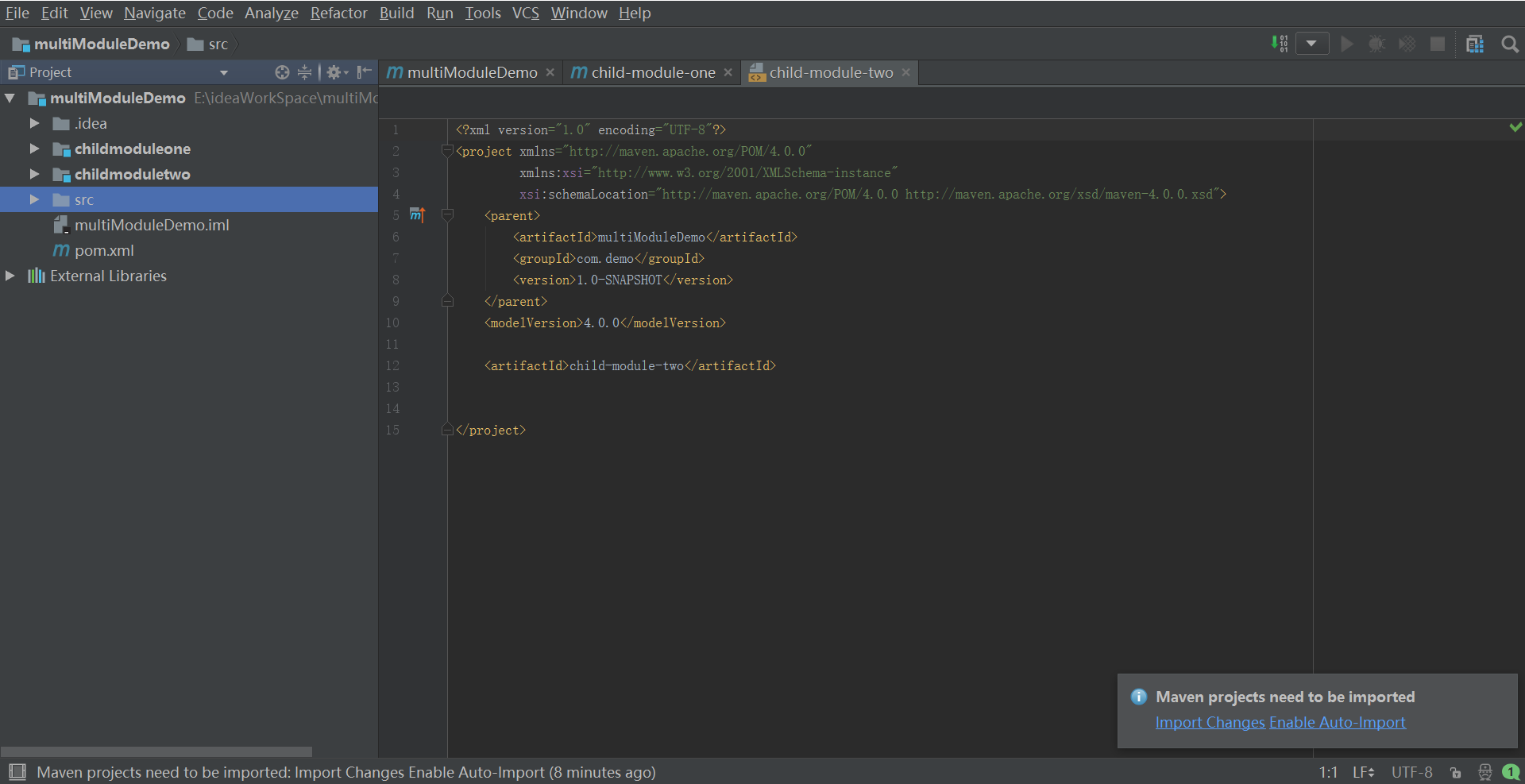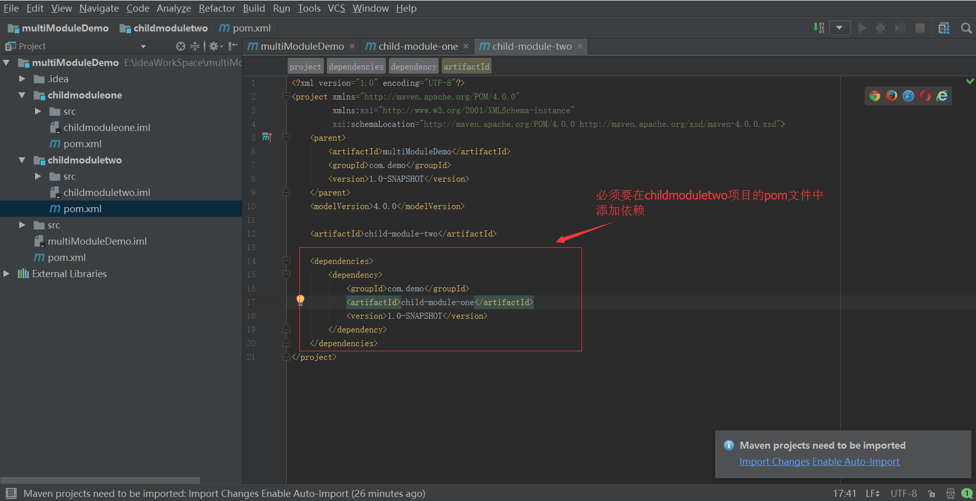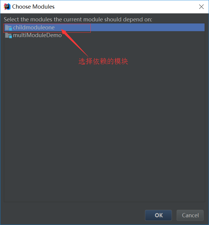 10 设置项目中childmoduletwo依赖于childmoduleone (另外,在pom文件中dependency 中可以把其他模块放进去,也是可以达到达到静态编译和运行通过目的的)