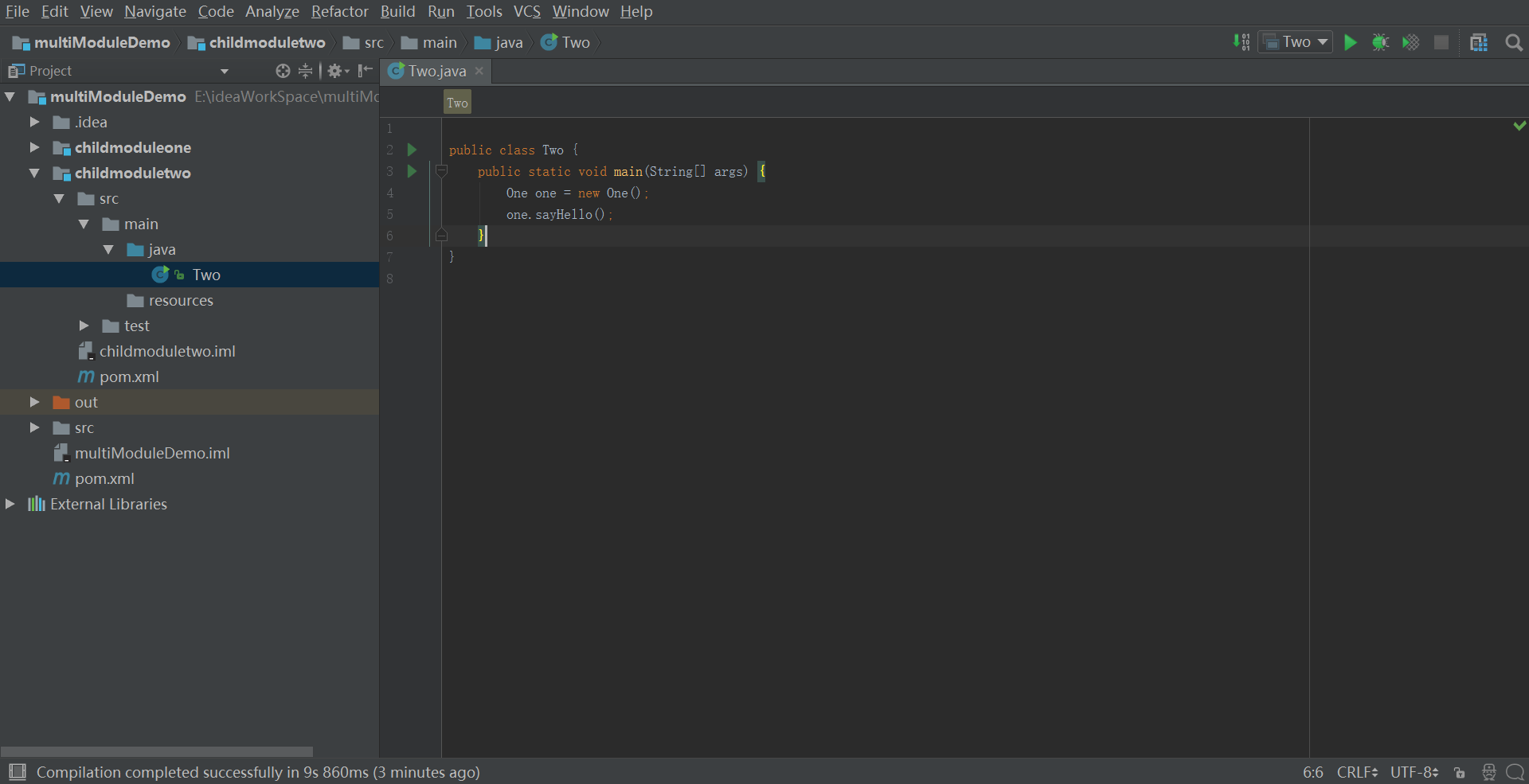 14 childmoduletwo中写一个类Two,用来调用One中的sayHello方法