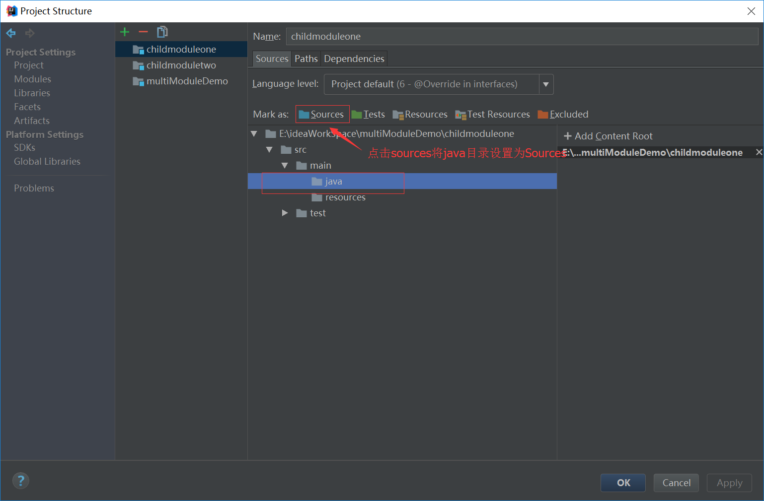 9 打开Project Structure将2个子模块的src/mian/java目录设置为Sources,只有设置为sources了,后面才能创建Class. 现在最新的IDEA已经把Java等设置为source了。可以不再设置