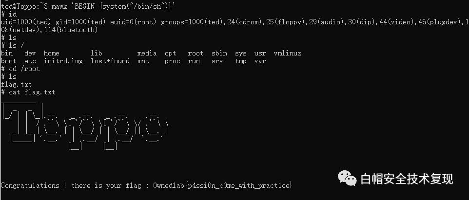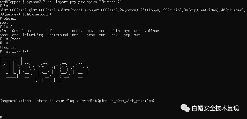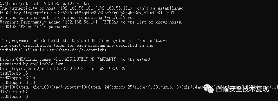 根据提示是知道目标靶机的密码,但是不知道用户名,这个时候尝试试试看的态度,看用户名是否是ted,通过这个用户名使用ssh去登录目标靶机