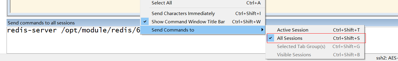 为了方便操作可以在xshell或SecureCRT中,进行批量,如下面的在SecureCRT中,设置将命令发送到所有会话