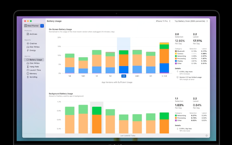 诊断数据API获取的数据是显示在Xcode中的功能和性能视图(上图)中的数据。有另外一个session: Identify trends with the Power and Performance API[7] 详细讲解其中的具体数据内容。