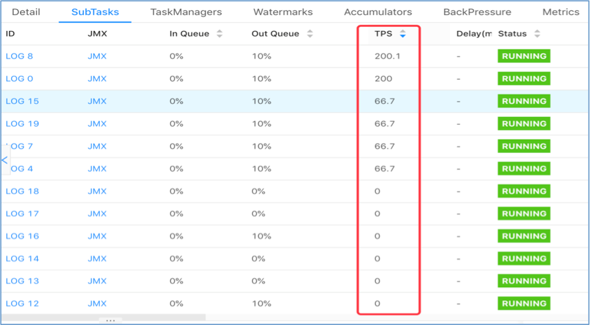 然而实际上线测试时出现了数据倾斜,不同并发间会出现负载不均,部分 task 接收不到数据从而 TPS 为 0: