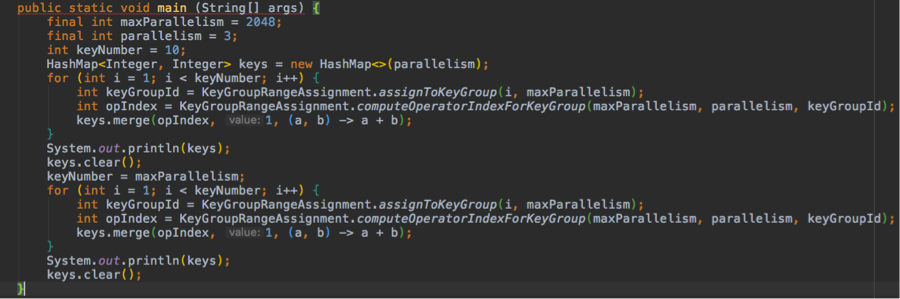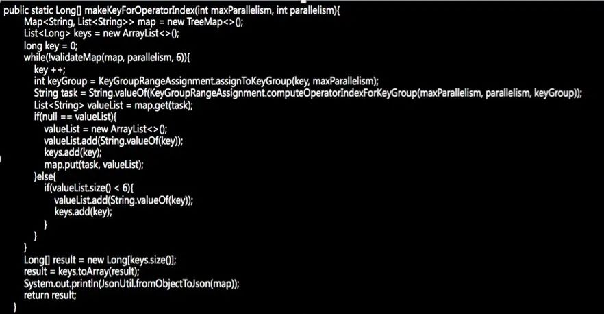 我们利用 maxParallelism 和 parallelism 生成 key,并将其存储到一个大小为 parallelism 的 map 里,以 taskid 作为 map key ,每个 task 对应的 key list 作为 value,来保证每个 taskid 对应的 list 都存储了相同数量的 key。