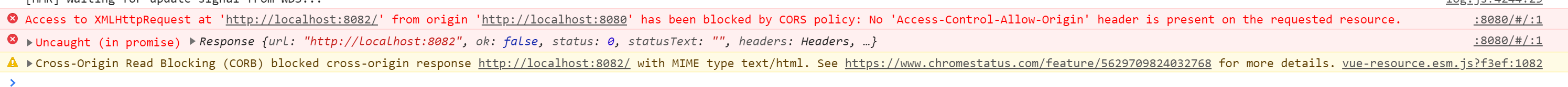 由于没有跨域的接口,所以,用8080端口请求8081端口,来模拟跨域。跨域会出现下面报错。