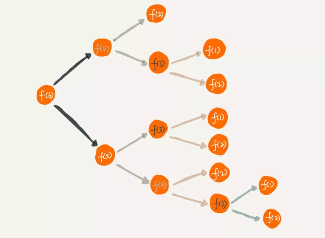 由些可知时间复杂度是指数级别,显然不可接受,那回过头来看为啥时间复杂度这么高呢,假设我们要计算 f(6),根据以上推导的递归公式,展示如下
