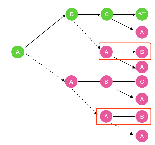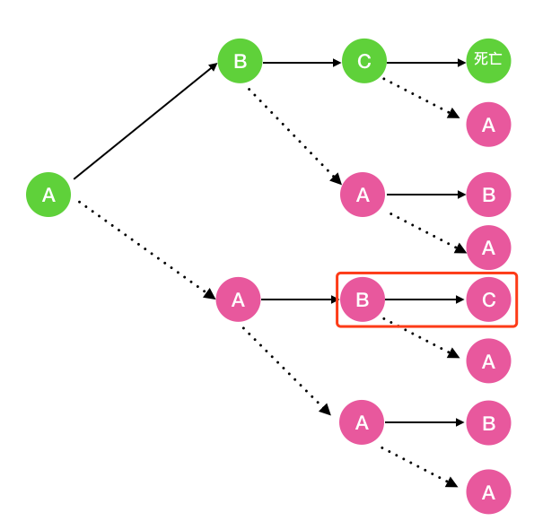图中的 A 代表细胞的初始态, B代表幼年态(细胞分裂一次), C 代表成熟态(细胞分裂两次),C 再经历一小时后细胞死亡 以 f(n) 代表第 n 小时的细胞分解数 fa(n) 代表第 n 小时处于初始态的细胞数, fb(n) 代表第 n 小时处于幼年态的细胞数 fc(n) 代表第 n 小时处于成熟态的细胞数 则显然 f(n) = fa(n) + fb(n) + fc(n) 那么 fa(n) 等于多少呢,以n = 4 (即一个细胞经历完整的生命周期)为例