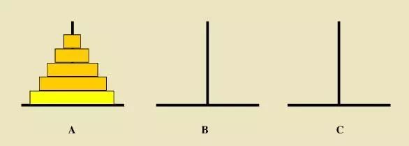 接下来我们看一下大学时学过的汉诺塔问题: 如下图所示,从左到右有A、B、C三根柱子,其中A柱子上面有从小叠到大的n个圆盘,现要求将A柱子上的圆盘移到C柱子上去,期间只有一个原则:一次只能移到一个盘子且大盘子不能在小盘子上面,求移动的步骤和移动的次数