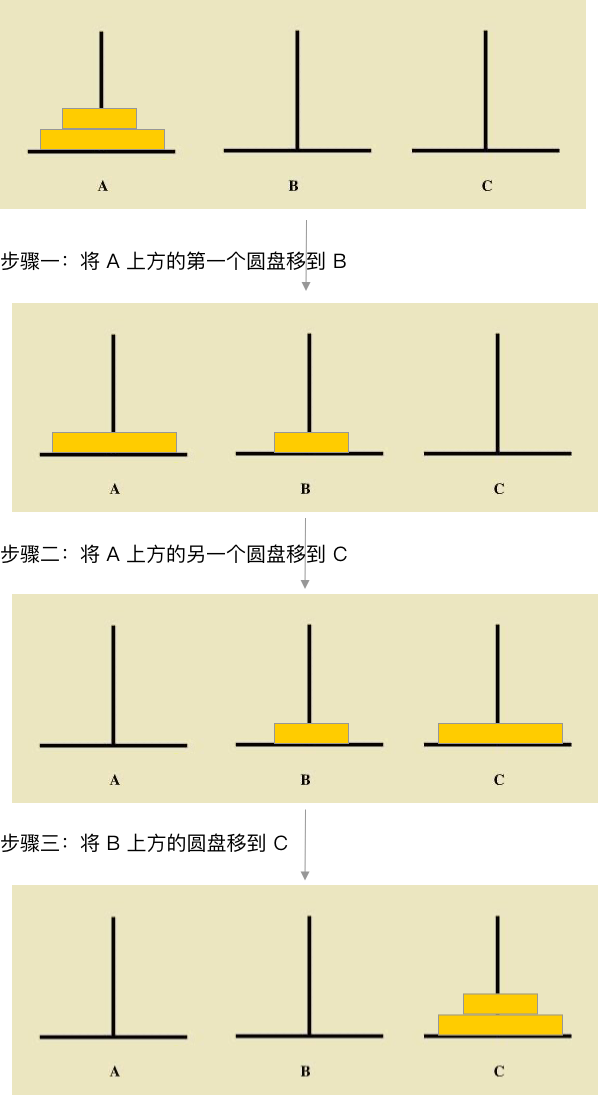 2.查找问题与子问题的关系 首先我们看如果 A 柱子上只有两块圆盘该怎么移