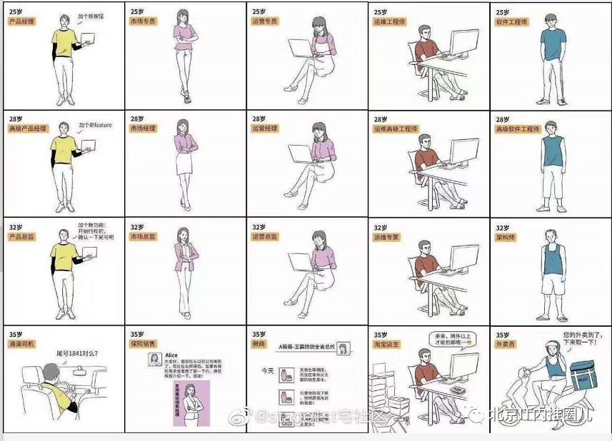 这张图片上用了一种比较特殊的手法,描绘了产品经理、市场专员、运营专员、运维工程师、软件工程师的一步步晋升,到一步步衰落